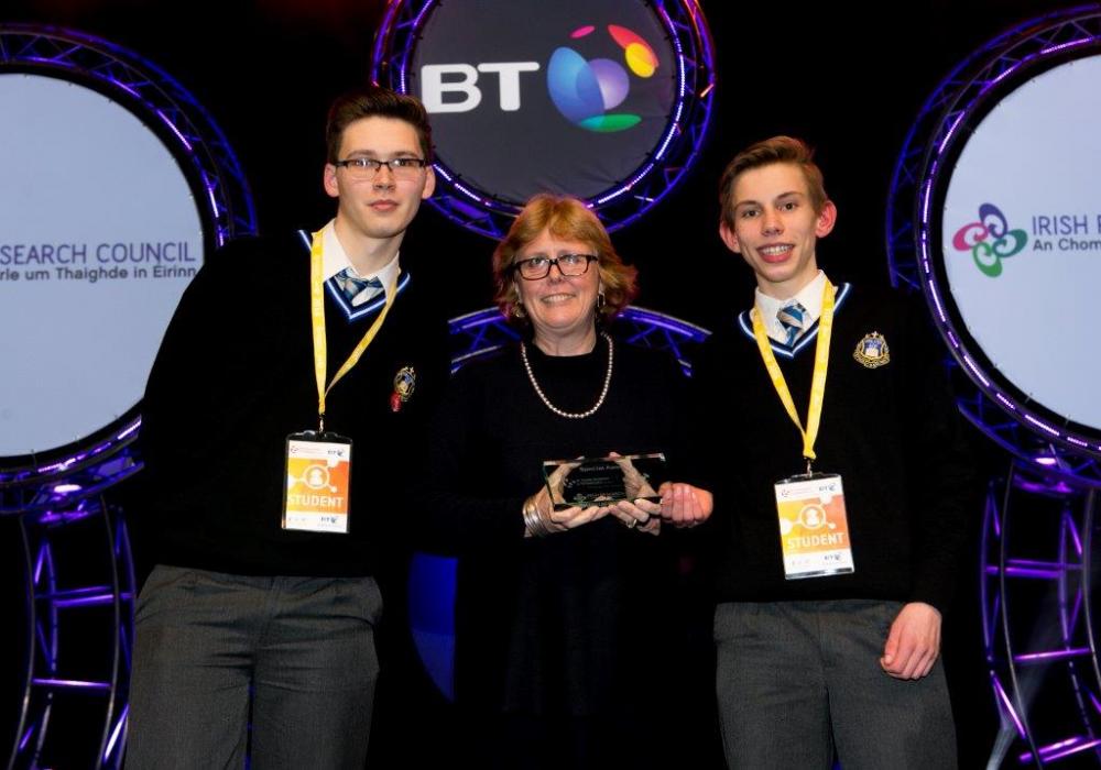 The Irish Research Council Award was presented by Chair Professor Jane Ohlmeyer to Gabriel Barat and Adrian Wolniak of Synge Street CBS, Dublin, for their project ‘A Mathematical Model of Coffee Rust’. The pair also won the runner-up group prize for which they received a cheque for €1,200 and a BT perpetual trophy.