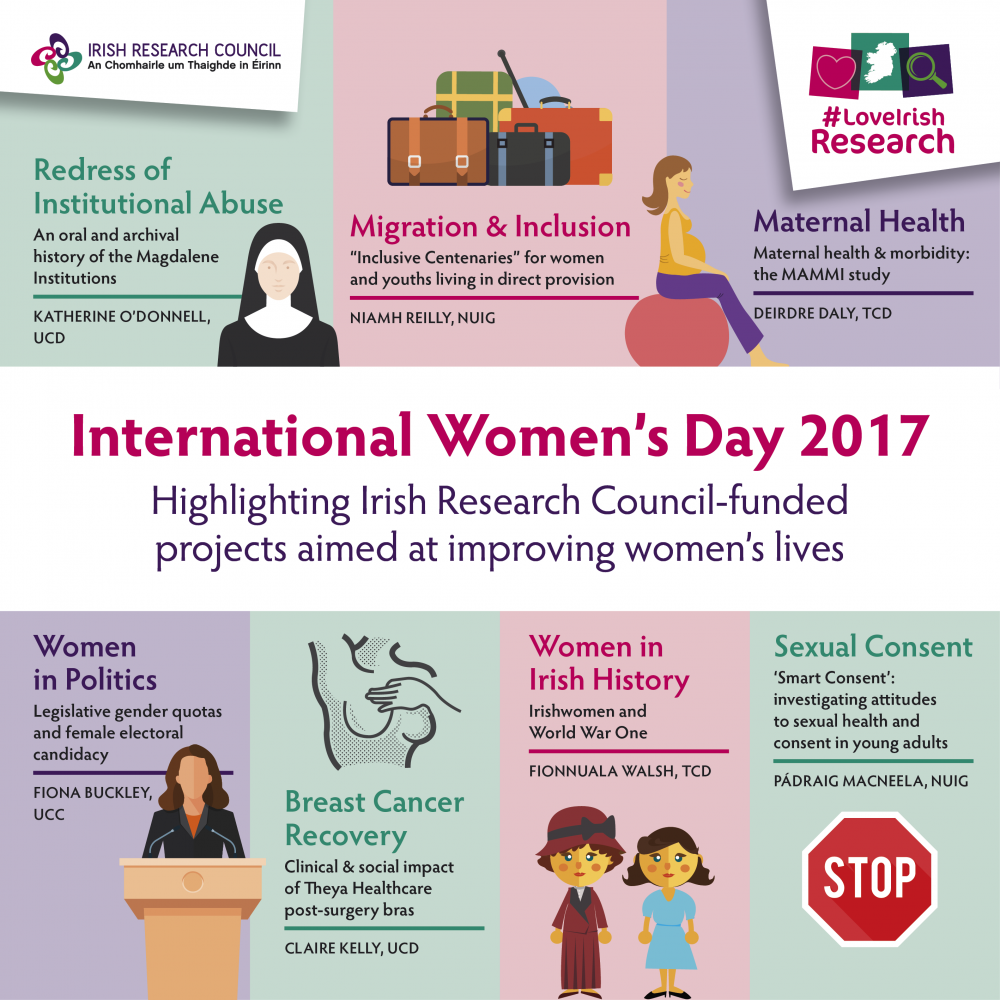 The Irish Research Council has today released a specially commissioned infographic highlighting research projects aimed at improving the lives of women in advance of International Women’s Day 2017.