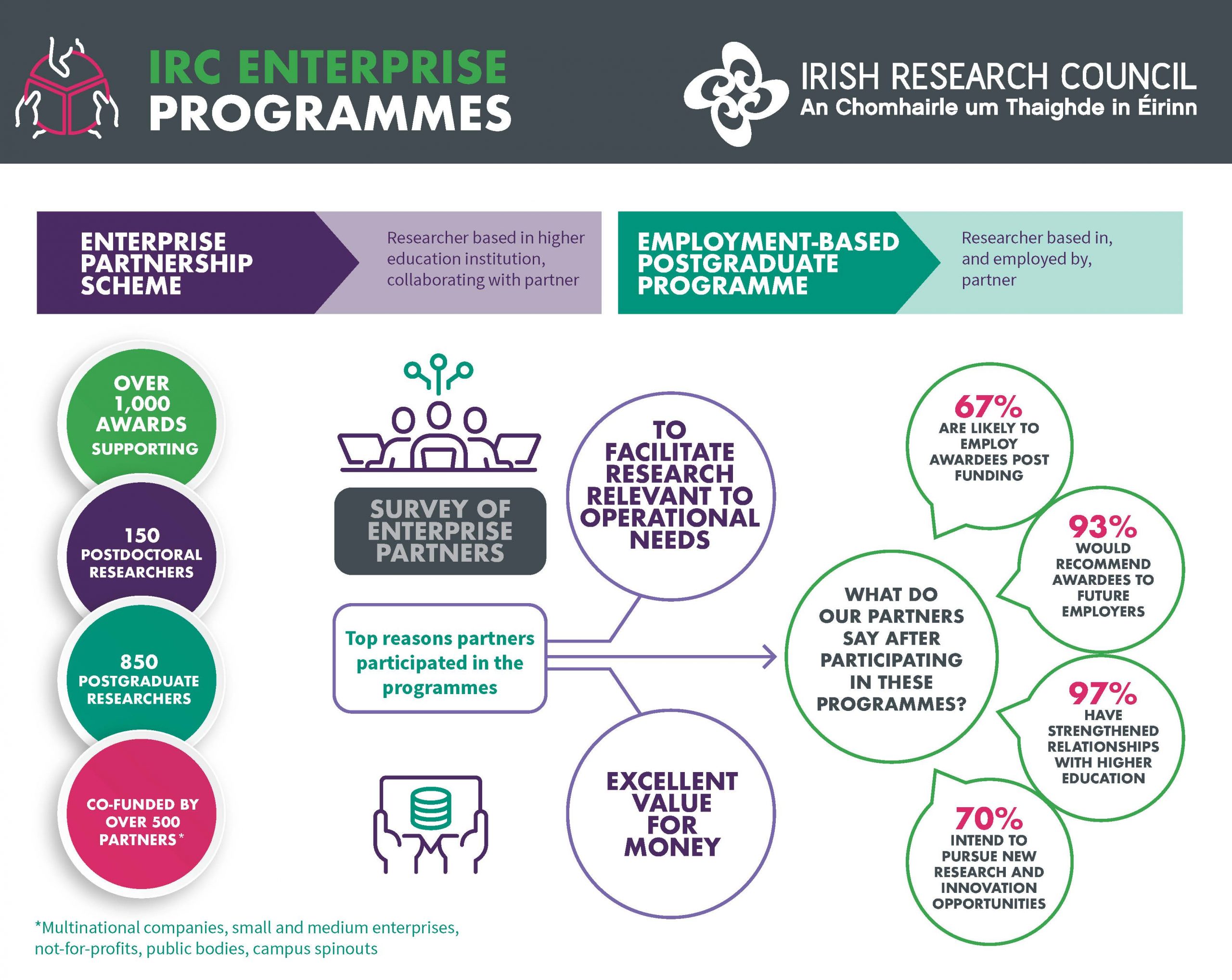 Each year, the Irish Research Council partners with around 70 organisations, ranging from multinational corporations to SMEs, public-sector agencies and non-governmental organisations, under its enterprise programmes.