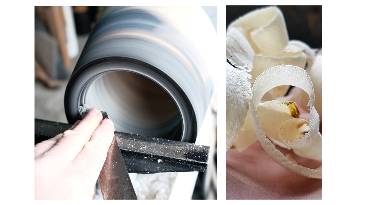 The IRC Researcher of the Year Awards pieces were taken through a series of processes before reaching the finished work. With my chain saw I cut the wood from a tree trunk to a size that the lathe can spin easily, making ready for the initial rough cut. The decisions that determine the finished piece are mostly all made at this stage in terms of colour, form and overall design. My decisions are informed by the qualities of the piece of wood itself as the first cut reveals the grain and any faults or knots that need to be considered.
