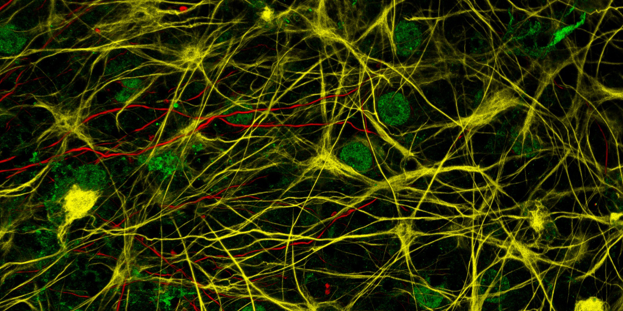 Maria Velasco, Irish Research Council Scholar, ‘The cerebellar network between neurons (red), astrocytes (yellow) and microglia (green) in a mouse organotypic slice culture’.