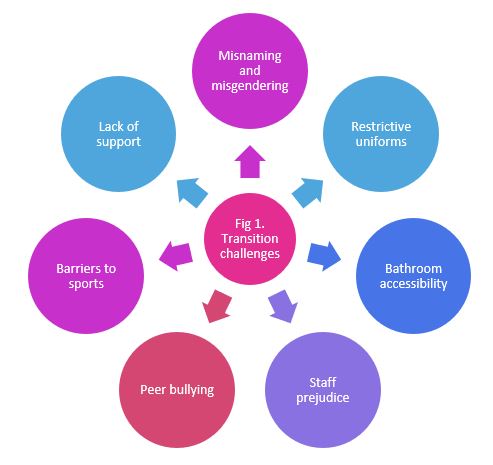 Despite experiencing marginalisation, most of the transgender and gender diverse youth described how they disclosed their gender identity to a trusted member of staff who was accepting. All of the young people who transitioned (i.e. began living in their self-determined gender identity) during their secondary school education reported experiencing challenges in relation to their transition (see Fig. 1). Some encountered minor difficulties, however, the majority of transgender and gender diverse youth faced multiple, overlapping challenges that negatively affected their physical and mental health, sense of safety within school, and their ability to participate fully in their education. Experiences of marginalisation compelled many trans and gender diverse youth engage in activism in order to raise awareness about gender diversity in their schools.